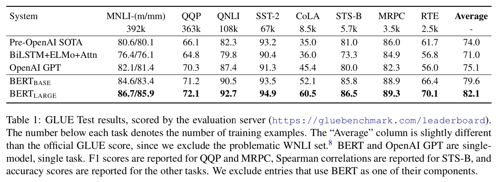 - \(\mathbf{BERT}_{\mathbf{BASE}}\) 는 OpenAI GPT와 비교하기 위해, 이와 동일한 모델 크기를 가짐.