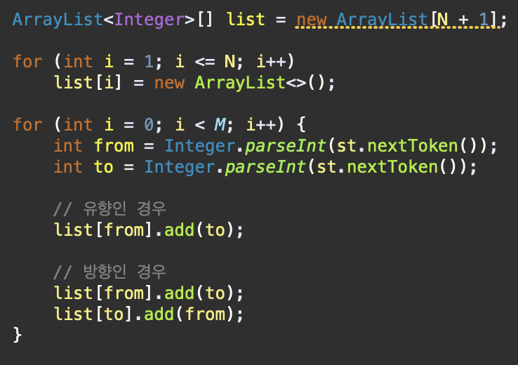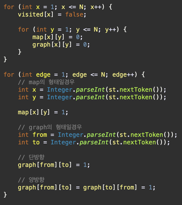 - Map의 경우, 해당 포인트가 존재 (ex. 집이 있다) 하거나 Graph의 경우, 각 정점끼리의 간선이 존재 (ex. 연결되어 있다, 길이 있다) 라면 해당 배열 인덱스의 값을 1로 바꿔준다.