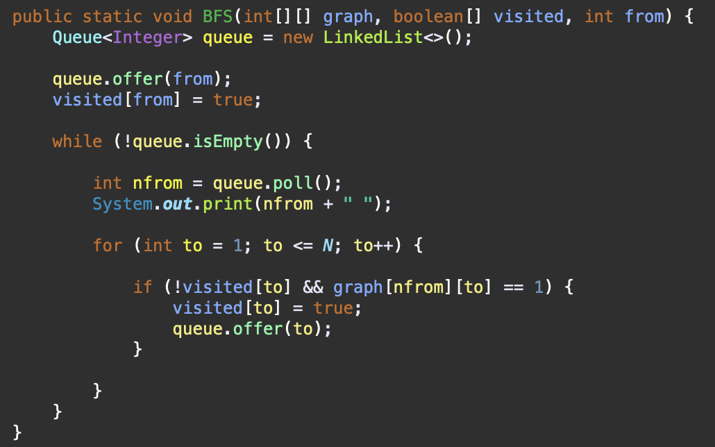 - 먼저 큐의 맨 앞인 front 정점 (nfrom) 과 연결된 모든 정점들 (to) 을 찾아 큐에 집어 넣는다 (for 문을 통해). 연결되지 않았다면 큐에 들어가지 않을 것이다.