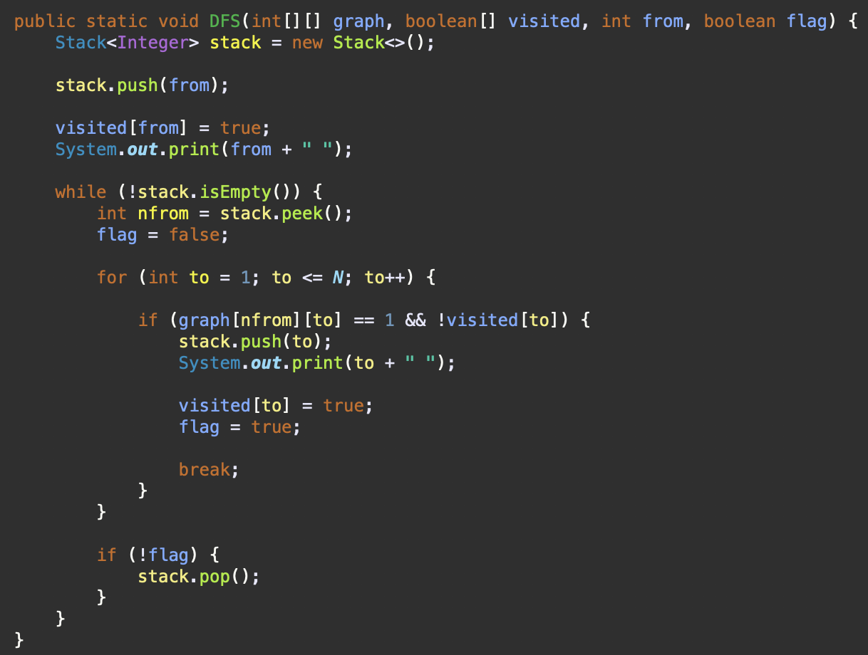 - 핵심은 if문 내에서 break를 통해 정점과 연결된 정점을 찾을 경우, for문을 빠져나옴으로써 DFS 탐색이 진행된다.