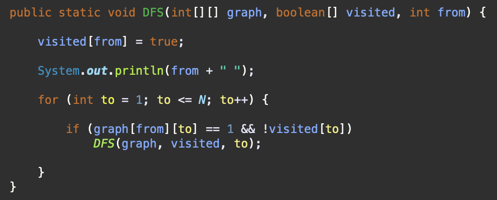 - 재귀의 경우, from 정점과 to 정점이 연결되어 있고 (graph[from][to] = 1), 아직 방문하지 않았다면 (visited[to] == false),