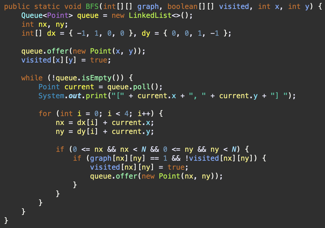 - visited 배열의 경우 그래프에서는 정점을 방문했는지 여부를 확인하기 위해 1차원으로 선언하였지만, 맵의 경우 해당 좌표가 방문되었는지를 확인하기 위해 2차원 배열 (x, y) 로 사용한다.